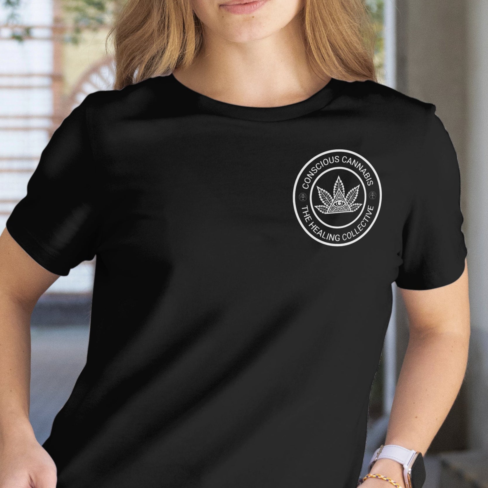 <div>A clean, conscious cannabis graphic t-shirt that speaks your vibe without shouting. The circle emblem fuses a stylized leaf with an all-seeing eye and the words “Conscious Cannabis / The Healing Collective.” Printed front-left chest for the subtle flex and big & bold on the back for the statement. Soft hand feel, everyday fit—perfect for festivals, errands, or couch-vibes.</div> <div><span> • Features: Front chest emblem + full back print; soft touch ink; durable print</span></div> <div><span> • Materials: Ringspun cotton jersey (midweight)</span></div> <div><span> • Fit: Unisex regular fit; true to size</span></div> <div><span> • Care: Machine wash cold, inside-out; tumble dry low; do not iron print</span></div> <div><br></div> <div>Fit tip: If you like an oversized look, size up one.</div> <div><br></div> <div>Why you’ll love it</div> <div><span> • Comfy daily tee with a conscious message</span></div> <div><span> • Minimal black-and-white palette pairs with anything</span></div> <div><br></div> <div>Details</div> <div><span> • Color: Black with white print</span></div> <div><span> • Print placements: Left chest + center back</span></div> <div><span> • Season: All-season streetwear</span></div> <div><span> • Designed & printed by Irie Swag</span></div>
