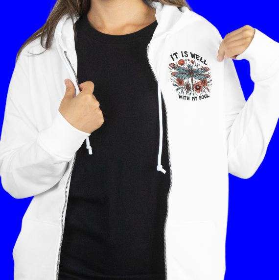 <p>The It Is Well With My Soul zip hoodie features a peaceful floral dragonfly design with a small left-chest print and a large back graphic. Soft fleece fabric and a classic unisex zip fit make it a comforting, faith-centered layer for everyday wear.</p><ul> <li>Cotton/poly fleece</li> <li>Front left-chest print + large back print</li> <li>Unisex zip hoodie fit</li> <li>Machine wash cold, inside out; tumble low</li> </ul><p><strong>Fit Tip:</strong> Size up for a relaxed, cozy feel.</p><p><strong>Why You’ll Love It:</strong></p><ul> <li>Serene dragonfly artwork with floral accents</li> <li>Faith-inspired message for daily comfort</li> </ul>